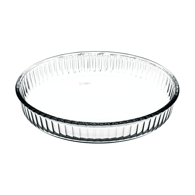 PASABAHCE brand baking tray. Made of yen glass. The tray is in a round shape with a diameter of 32 cm. Yen glass cookware is extremely heat-resistant and can withstand temperatures from -40° to 300°C. What is specific about this type of vessel is that the temperature changes must be smooth. They should not be placed in a preheated oven or on a hot plate and should not be placed cold in them when heated. Otherwise, we risk cracking the vessel.