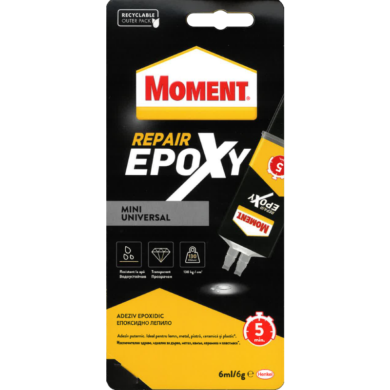 Moment Repair Epoxy Universal-Epoxidkleber verbindet, repariert und restauriert qualitativ verschiedene Materialien wie Metall, Holz, Keramik, Porzellan, Gummi, Glas, Pappe und Kunststoff.