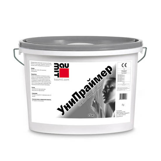 Universal primer UniPrimer by BAUMIT in a tank of 25 kg. The BAUMIT universal primer is widely used - both outdoors and indoors. It is suitable for laying floors, walls and ceilings. Improves adhesion and evens out the absorbency of surfaces, as well as ensures uniform color of the final coating.