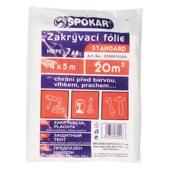 SPOKAR masking protective nylon, which is used to cover floors, furniture and other surfaces, protecting them from dirt, staining with paint, moisture, dust, etc.Ideal for use in painting and construction and repair work. The thickness of 7 microns makes it conveniently easy to carry on the one hand, and on the other hand - reliable that it will not move during operation and allow unwanted contamination. The size of 4 x 5 m is well chosen to cover the surfaces in a room of a standard home.