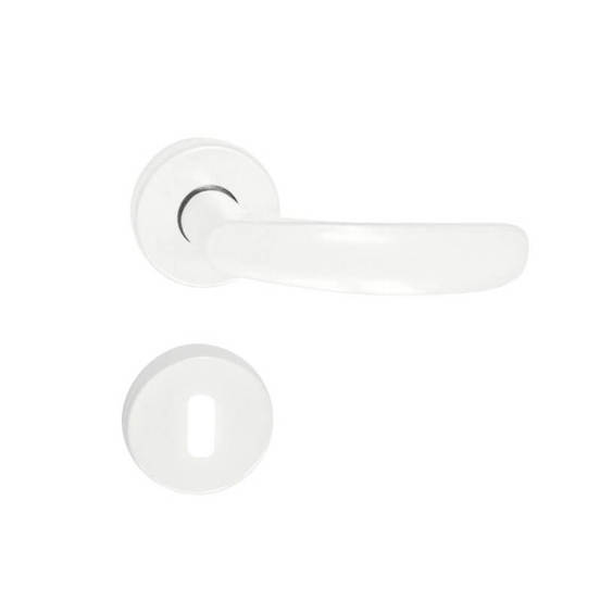 Simple door handle SONICO from the Silistra series with a rosette in white. Set of 2 The handle is intended for installation on entrance doors, interior doors, service rooms, etc. with interior lock installed. Handles of this type are preferred for rooms where maximum security is not sought. These can be balcony doors, office doors, production room doors and others.