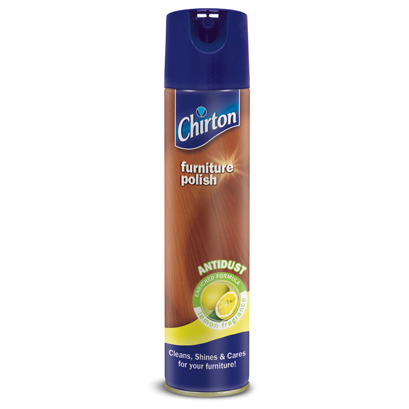 Furniture preparation "Lemon" by CHIRTON. It is characterized by its antistatic effect. Cleans dirt and polishes surfaces, restores the natural beauty of wood, removes dust, fingerprints, stains. It is used for wood as well as for marble, ceramics, plastic, chrome and enameled products. Contains: over 30% aliphatic hydrocarbons, perfume, etc. The furniture preparation is available in a bottle of 300 ml.