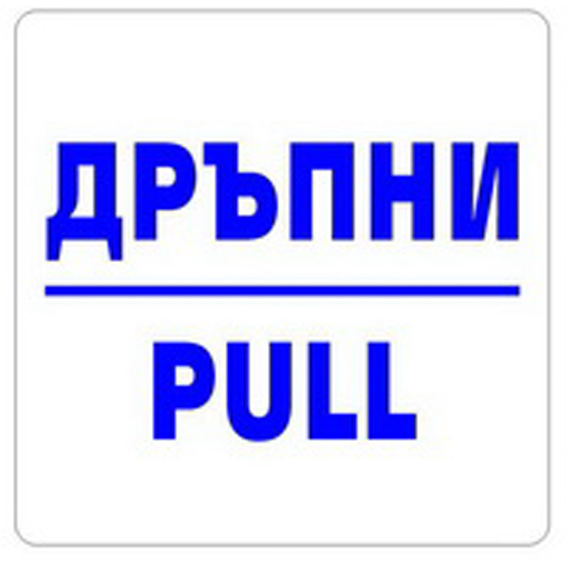 Self-adhesive sticker APLI with dimensions 114 x 114 mm, designed for glass doors, showcases and more. This sticker is intended for gluing on the inside of the glass. It is placed facing the transparent window or the entrance of a store, public institution, etc. The sticker has an inscription in two languages, indicating how to open the front door in a building.