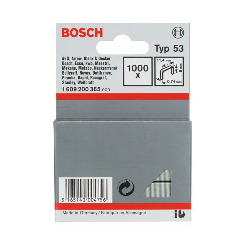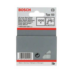 Metal brackets for manual tucker TYP 53 by BOSCH. Tacker clamps are 8 mm long and 11.4 mm wide. Available in a pack of 1000 pieces.