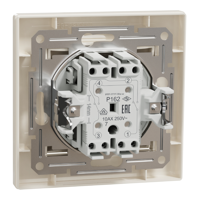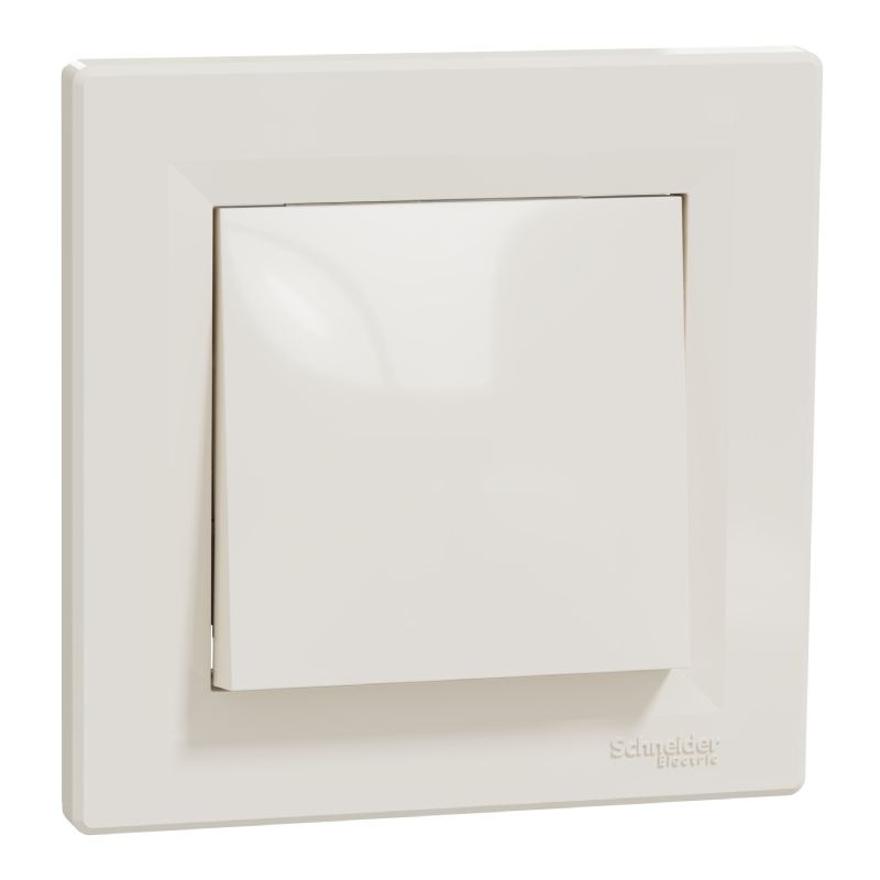 Single cross-shaped lighting switch from the Asfora series by SCHNEIDER ELECTRIC, suitable for concealed installation. Equipped with a decorative frame and made of sturdy ABS material in cream color. Nominal characteristics: 10 A, 250 V, IP20. Dimensions: 83 x 83 x 43 mm - a stylish and functional solution for any room.