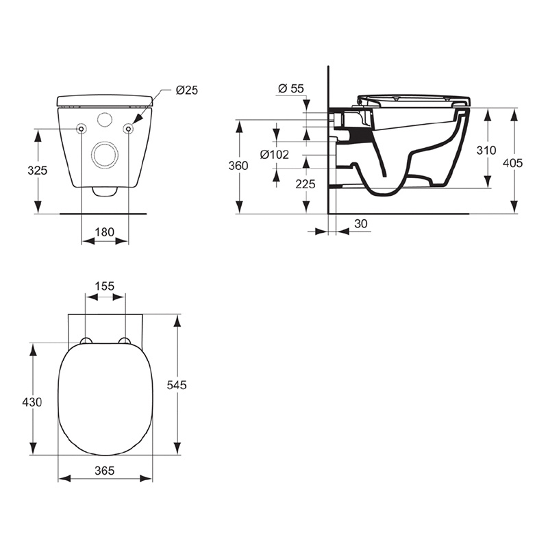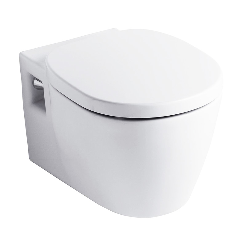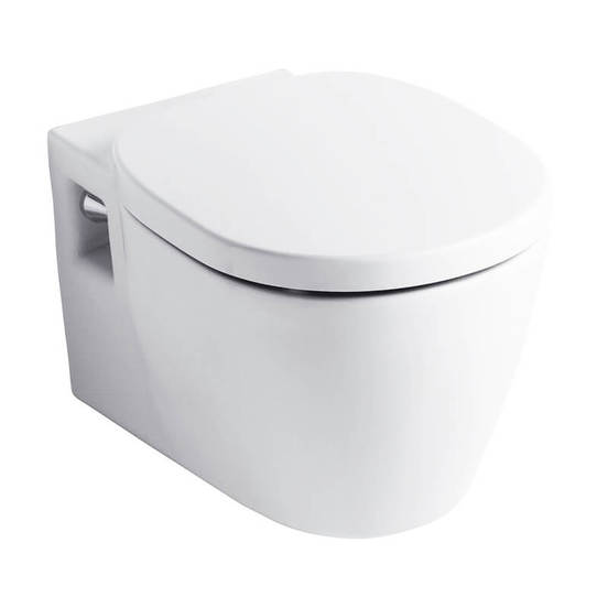 Cantilever porcelain toilet bowl for wall hanging Connect IDEAL STANDARD. The toilet bowl has a rear drain and measures 36.5 x 54.5 cm.