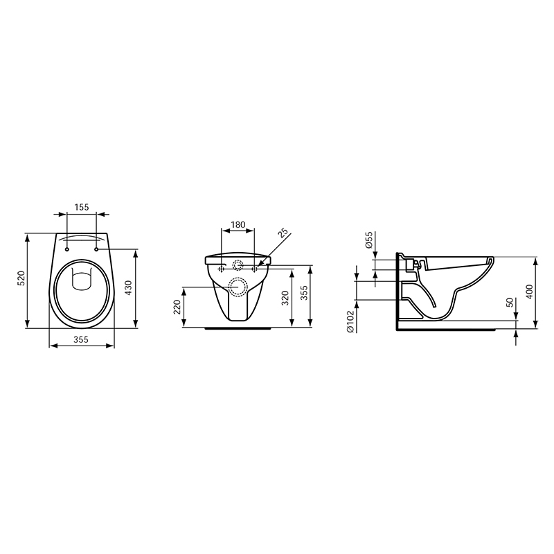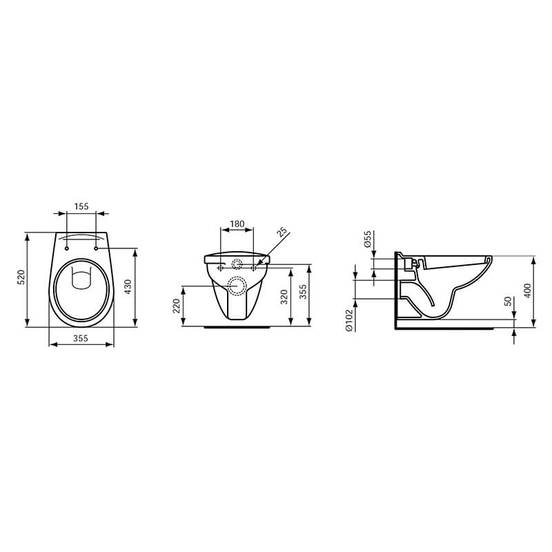 Cantilever porcelain toilet bowl for wall hanging Eurovit IDEAL STANDARD. The toilet bowl has a rear drain and measures 35.5 x 52 x 37 cm.