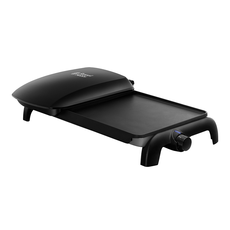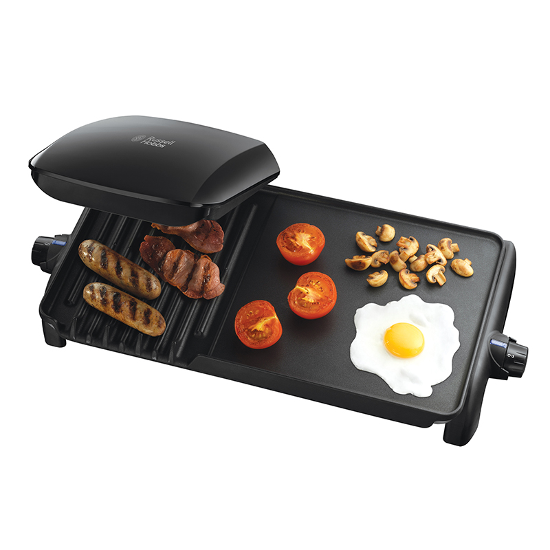 Grill and grill with power 2100W, ideal for large families and groups. You can prepare up to 10 portions at a time, including 4 portions on the grill and 6 on the grill. The grill channels separate the fat in a separate draining pan, which makes the appliance easier to clean. Floating hinges allow the preparation of thick foods. It has independent temperature control with the possibility of different temperatures on both parts of the grill. The device is also equipped with light indicators for switching on and temperature. There are easy-to-clean tiles with a non-stick coating.