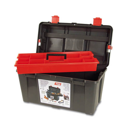 TAYG tool case + organizer model 32. Its dimensions are 480 x 258 x 255 mm. It is made of highly resistant PVC material. It has a strong, ergonomic handle for a secure and comfortable grip.