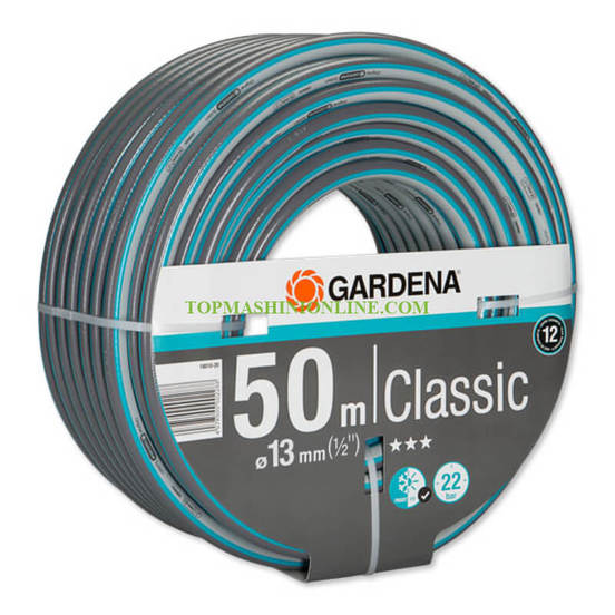 Pressure resistant hose from the Classic series of the GARDENA brand. The hose retains its shape thanks to high-quality textile reinforcement and does not contain harmful substances. It is resistant to UV rays. If necessary, the hose can be connected to a system of connectors and any irrigation accessories from the Original GARDENA System. Withstands pressures up to 22 bar. Its length is 50 meters and diameter - 13mm or 1/2".