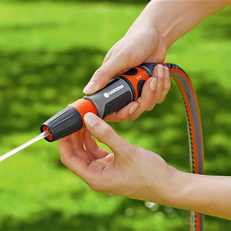 Adjustable nozzle with tap from the GARDENA brand, allowing you to adjust the flow to specific needs. Any force of the jet can be chosen - from fine fog to dense flow.The nozzle sleeve cannot be removed and therefore cannot be lost.The type of water jet is regulated smoothly.