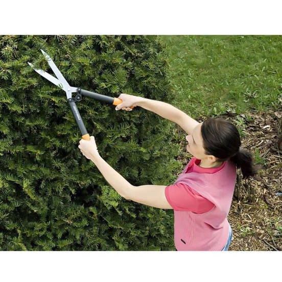 Garden shears for shrubs with lever mechanism of the FISKARS brand. The scissors are made of high quality steel and are characterized by high strength and low weight. Perfect for maintaining hedges, extremely convenient to use.The lever mechanism increases the cutting force and makes it much easier compared to other garden shears, which have a standard mechanism. This guarantees trouble-free and long-lasting operation of the tool.The length of the scissors is 54.4 cm.