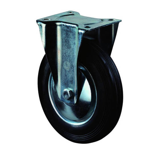 Stationary wheel on bushing with plate BS ROLLEN Ф100mm is a black rubber wheel with pressed steel discs for industrial applications with light load.The center of the wheel is made of electrolytically galvanized sheet metal, made of two riveted discs. The wheel is suitable for use with lightly loaded carts. Performs well in the presence of obstacles and indoors. This type of wheels are suitable for all types of floors, even outdoors.