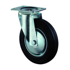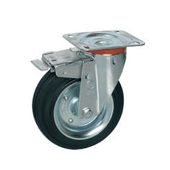 Swivel castor wheel and brake plate BS ROLLEN Ф80mm is a black rubber wheel with pressed steel discs for light-duty industrial applications.The center of the wheel is made of electrolytically galvanized sheet metal.The hub has a polyamide self-lubricating ordinary hole.
