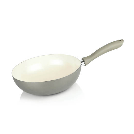 Wok pan made of high quality aluminum, ceramic non-stick coating, soft-coated handle for a stable grip and maximum comfort. The pan has a diameter of 26 cm. It is suitable for gas, halogen, electric, glass-ceramic and induction hobs. Can be used in the dishwasher.