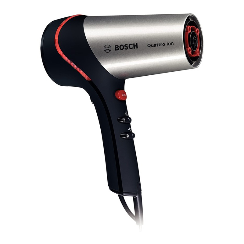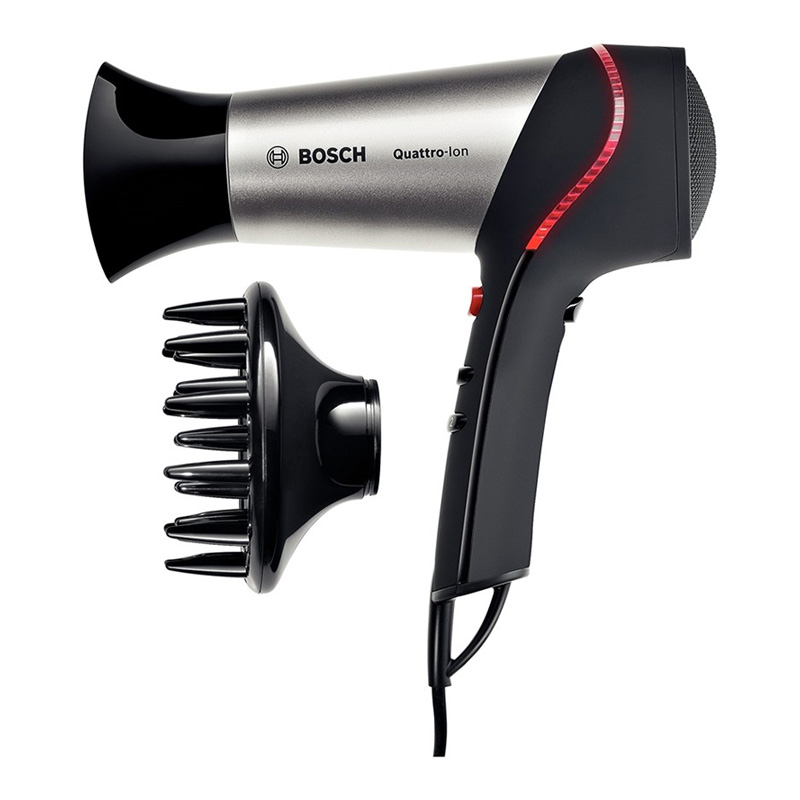 Hair dryer PHD5767 from BOSCH with 2000W power, Quattro-Ion technology and diffuser. The hair dryer has a soft and non-slip Softtouch handle. It is comfortable and has an ergonomic shape that fits very well in the hand. The set includes a concentrator for styling the hairstyle, as well as a diffuser for more volume.