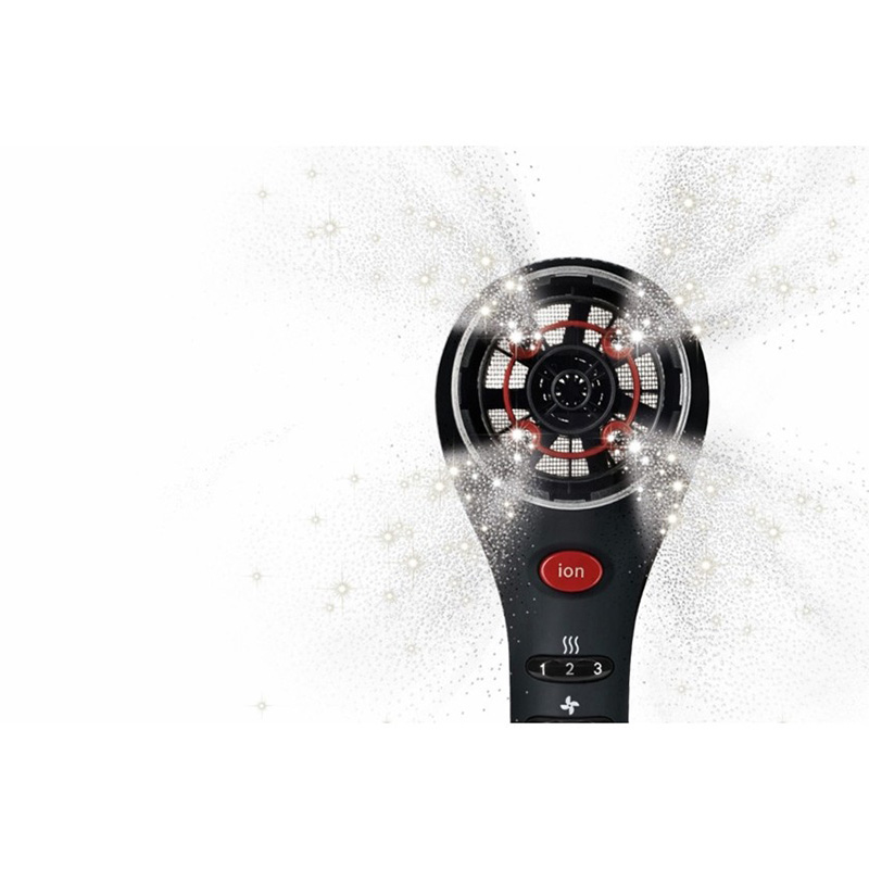 Thanks to quadruple ionization, the static charge of the hair is visibly reduced, and so the hair becomes noticeably soft, easy to comb and with a silky shine. As soon as the quadruple ionization is activated, a red line lights up on the hair dryer.