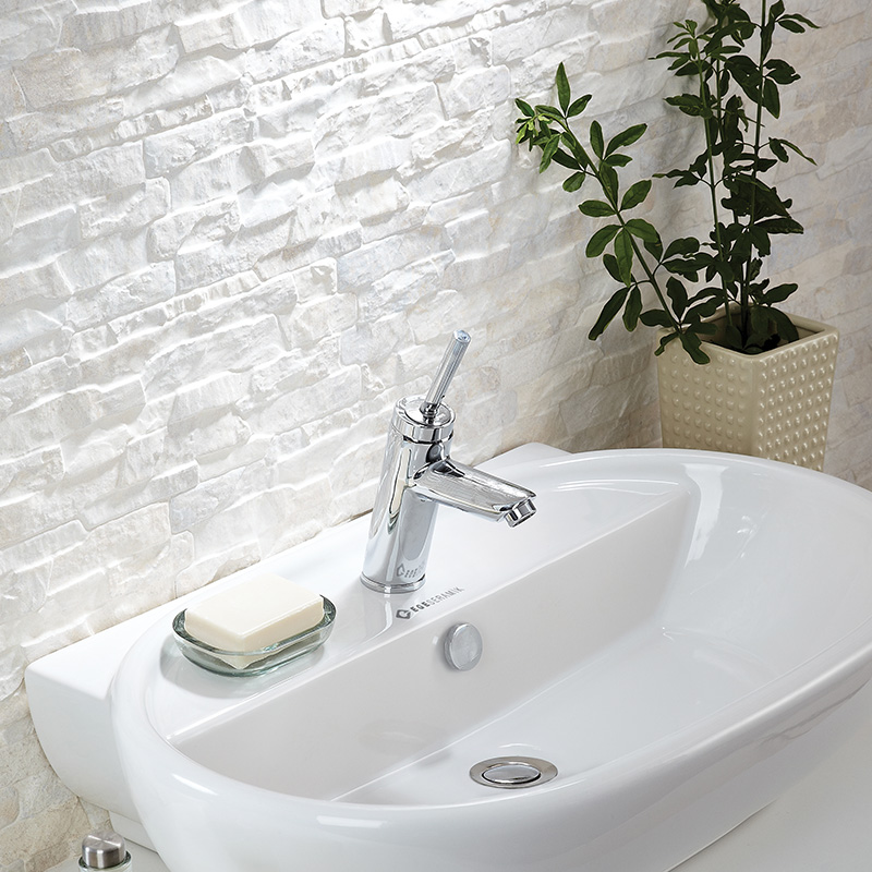 Facing stone from the Kronos Ivory series of the brand EGE SERAMIK in white color. The tiles are 15 x 40 cm in size and 9 mm thick. Their surface is matte. One carton contains 20 tiles with a roof area of 1.05 sq.m.