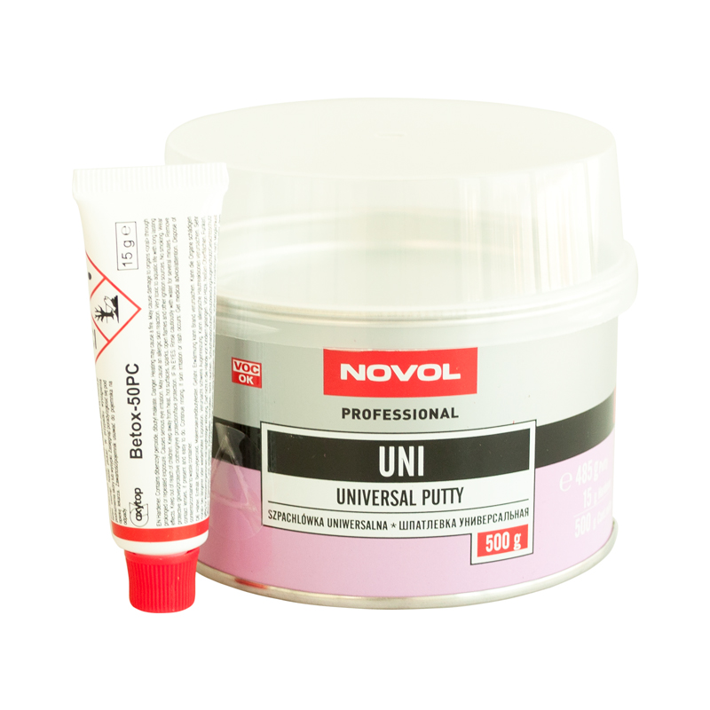 Basic filling putty NOVOL Uni in a package of 0.500 kg for application with a spatula. The relatively rigid elasticity does not allow the treatment of very large surfaces. It has very good adhesion to various kinds of bases such as polyester laminates, steel, aluminum, 2-component acrylic primer, old paint and more.