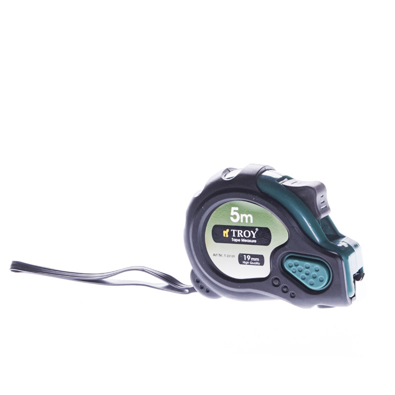 Tape measure with stopper and magnet TROY with a maximum length of 5 meters. There is rubber insulation for impact protection and a plastic body. The steel strip is 20% thinner and 19 mm wide. It has three functions for stop system and magnetic tip.