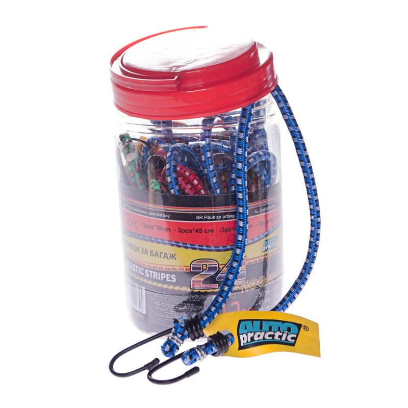 Set of 12 rubber bands with different sizes for attaching luggage. The hooks are made of metal and have a rubberized tip. The rubber bands are packaged in a plastic box with a handle for easy carrying and storage.