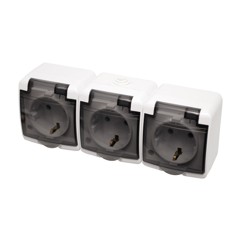 Triple electrical contact with MELOPLAM cover for outdoor installation. The method of installation is done with screws. Rated current 16A, voltage 230V and maximum power 3500W.The operating frequency of the triple contact is 50Hz. It has a high degree of protection against moisture IP44, which allows it to be installed in damp or outdoor areas. The electrical outlet is made of white plastic.