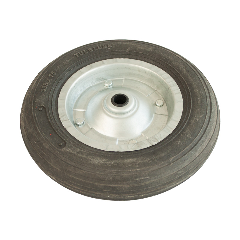 Spare tire for hand trolley with outer diameter ф335mm. The inner hole has a diameter of 20.4 mm. The bandage is made of rubber and the rim is made of punched sheet metal. The load capacity of the wheel is 100 kg.The product is a Bulgarian production of the AMC brand.