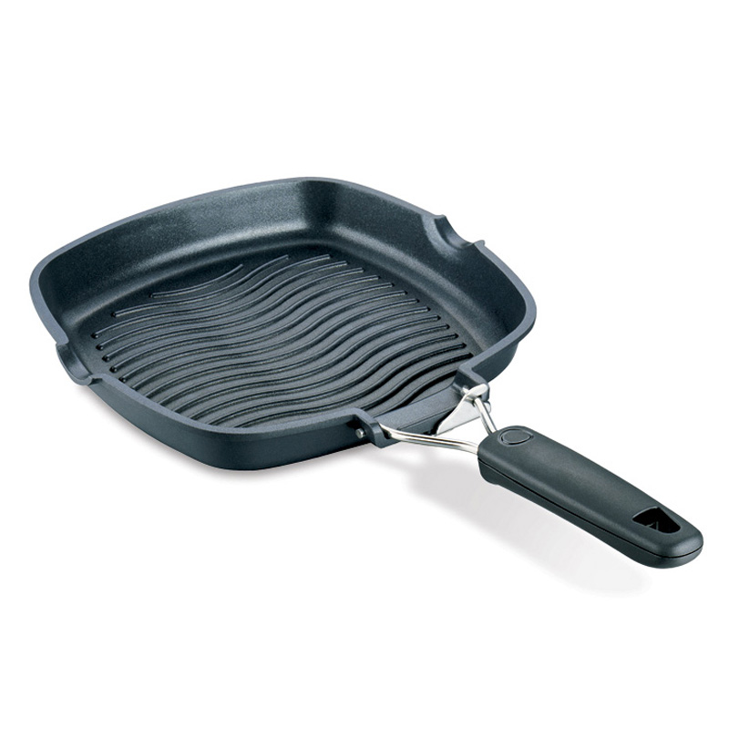 Grill pan from the Fine cast series of the KORKMAZ brand. The pan is in the shape of a square with dimensions of 20 x 20 cm. It is made of high quality aluminum with non-stick Teflon coating.
