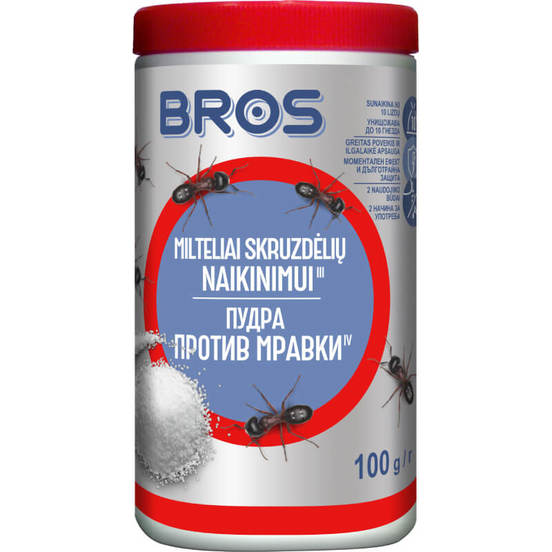 BROS brand anti-ant powder. It is an insecticidal preparation intended for use indoors in rooms and outdoors on terraces, gazebos, next to trellises, etc.