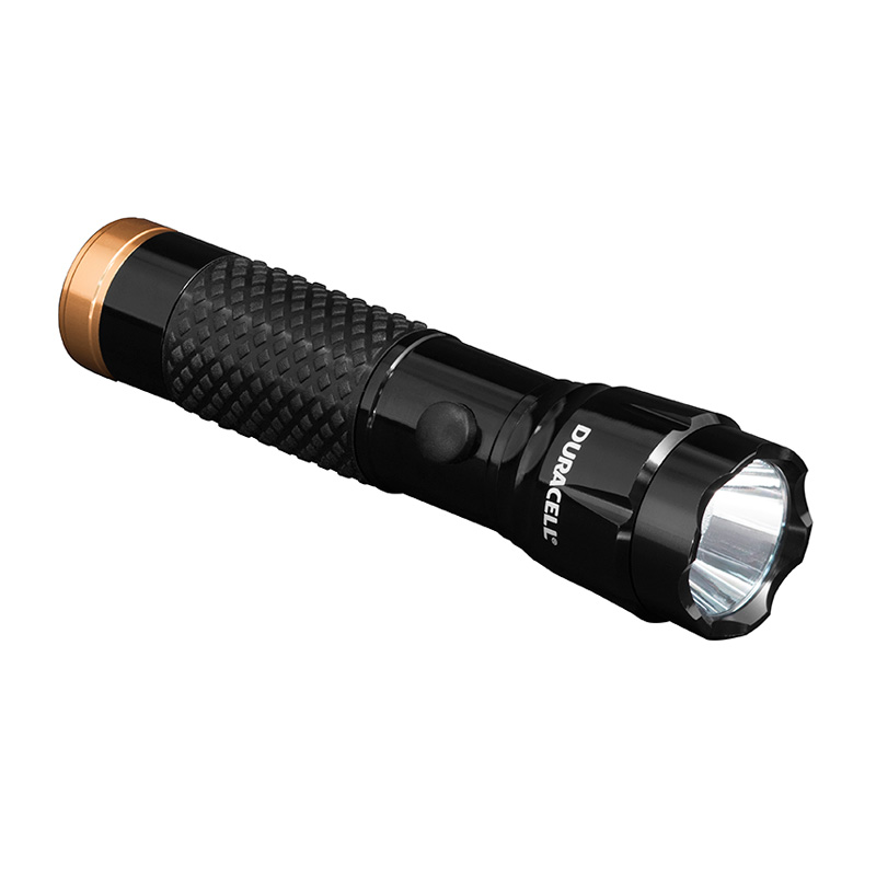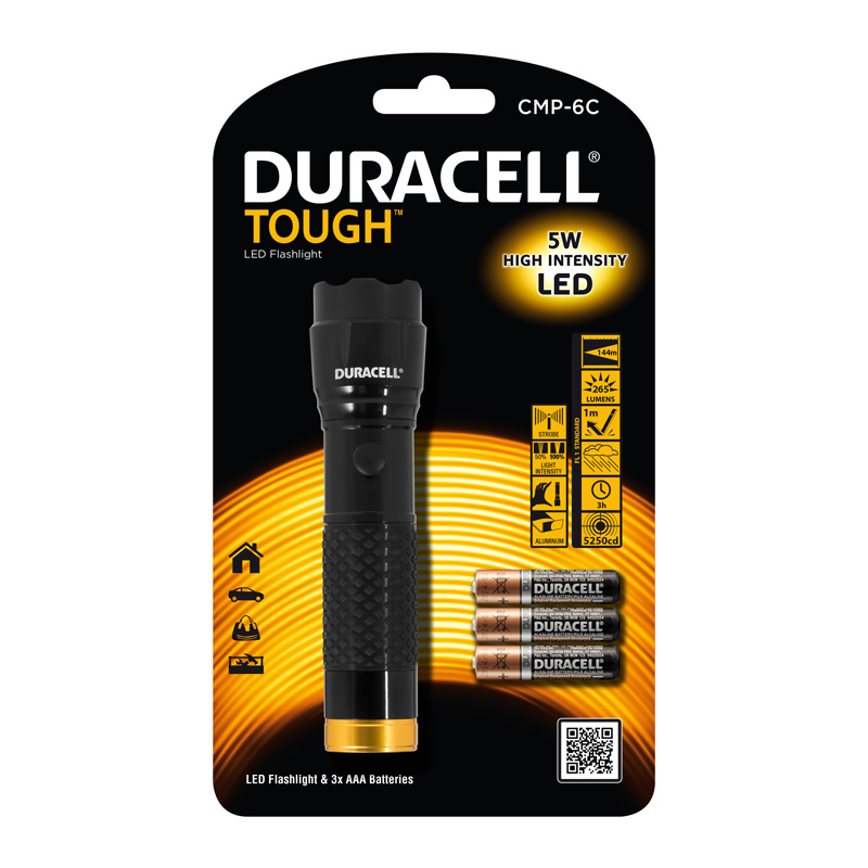 Pocket LED flashlight Tough Compact 6 C by DURACELL with high light intensity - 265 lumens and a wide range of light beam - up to 144 meters. It has a high power of 5W and the ability to adjust the light intensity. The DURACELL LED flashlight has high protection against moisture, thanks to its high-quality moisture-resistant aluminum housing.