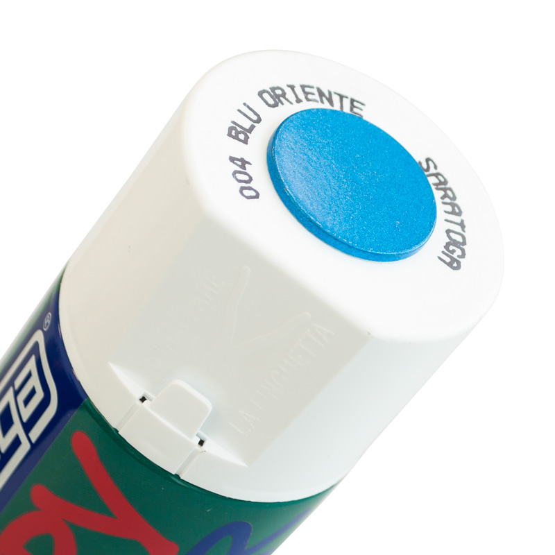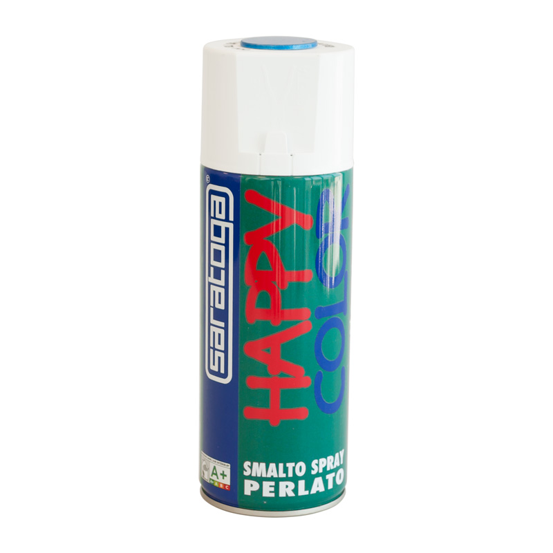 HAPPY COLOR SARATOGA spray paint is a quick-drying alkyd paint in pearl blue. It is used indoors and outdoors, drying to the touch in 15 minutes, and up to 45 minutes for complete drying.