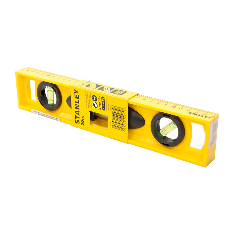 Level manufactured by STANLEY. The level is a multifunctional tool that is widely used in construction, carpentry services, etc. The STANLEY device is equipped with a line, and the device can measure objects up to 30 cm in size.