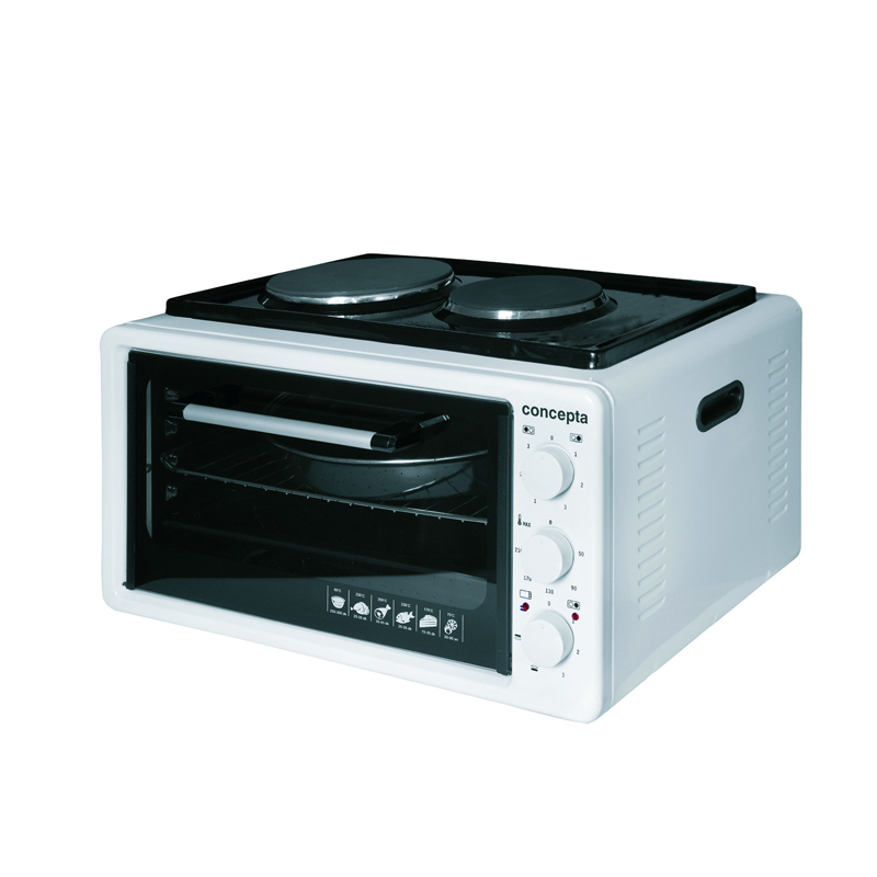 Small cooker EC 3620 of the brand CONCEPTA with two hotplates /large and small/ and oven with a volume of 36 liters. The model is in white.
