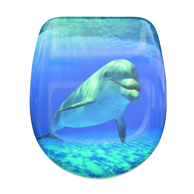 Dolphin toilet seat, made of Duroplast and with delayed fall function. The lid has a printed 3D image and standard sizes. Its beautiful design would fit into any modern bathroom, and the function of smooth closing will protect both the seat itself and the toilet bowl.