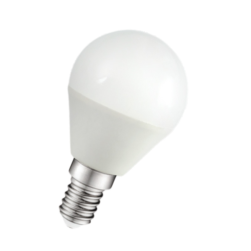 Frosted LED lamp of energy class A+. Type of ice lighting - SMD. The power of the lamp is 5W and its base is E14. The supply voltage of the luminaire is set at 175-250V/50Hz. The color temperature of the lamp is 4000K neutral daylight. The operating current of the LED body is 44mA. The angle of illumination is 160°. The color rendering index is Ra85. The LED body is made of plastic and the diffuser is made of polycarbonate. The capacity of the lamp is equivalent to 40W. The luminous flux is 396Lm. The size of the lamp is diameter F45 mm and length 74 mm.