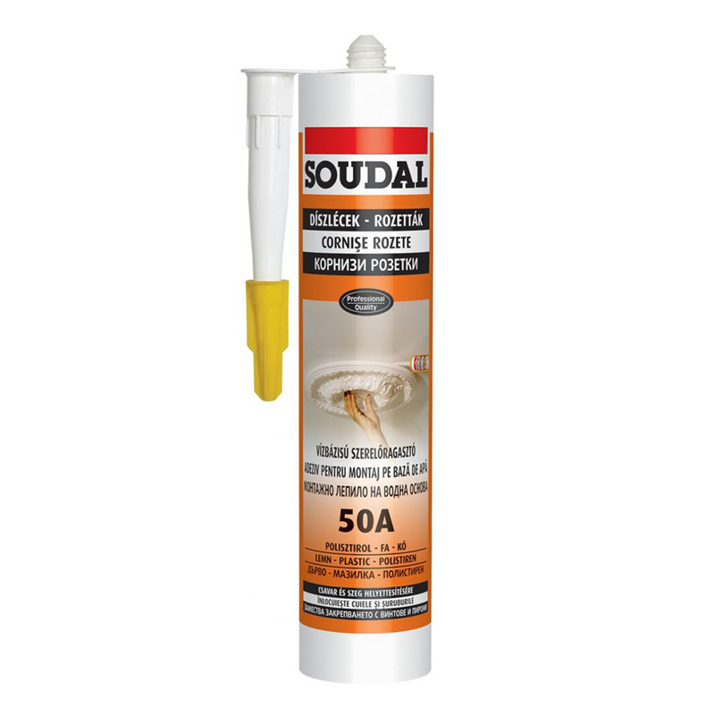 The adhesive is designed to compensate for small irregularities and cavities, while providing a reliable and long-lasting connection. Thanks to its water resistance, it can be used both in dry rooms and in areas subject to moisture. This makes it a universal solution for various repair and installation tasks. Soudal 50A is widely used for the installation and fixing of rosettes, profiles, decorative elements made of polystyrene and cork, skirting boards, thresholds, wooden panels and wood-based materials. It is also suitable for quick repairs and fixing of ceramic tiles, electric switches, plastic handles and other small accessories in the home.