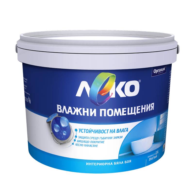Lightly paint of ORGACHIM 2.5 l, suitable for interior painting of walls and ceilings in damp rooms - bathrooms, kitchens, closets, laundry rooms and others. The paint is resistant to bacterial and fungal infections. Provides "breathability" of the walls, high whiteness of the coatings and good resistance to aging and yellowing. It has excellent coverage and resistance to wet rubbing and washing. Does not spray when applied and does not form a compacted precipitate when drying.