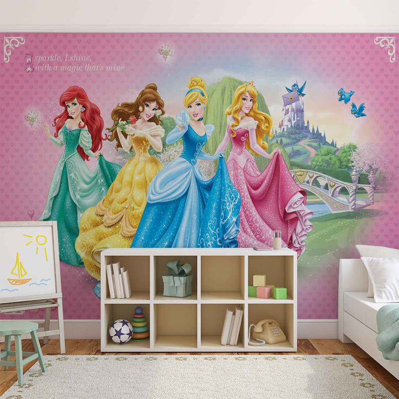 High quality, wide format photo wallpaper for a children's room with the image of princesses from popular Disney children's movies. Photo wallpaper is suitable for placing the wall in any room that is not exposed to high levels of humidity.