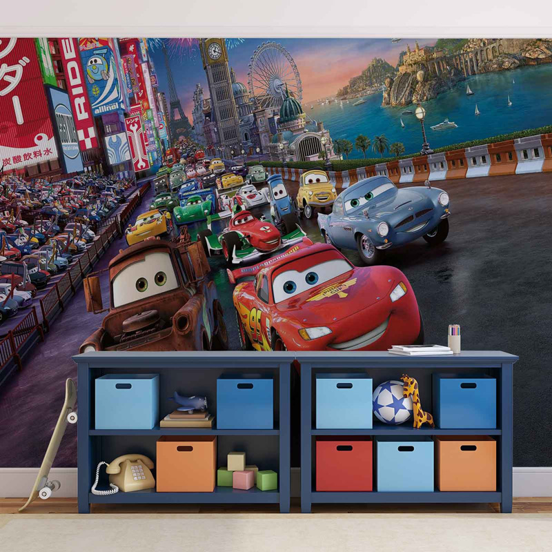 High-quality, wide-format photo wallpaper for a children's room with an image of the characters from the children's movie Cars. Photo wallpaper is suitable for placing the wall in any room that is not exposed to high levels of humidity.
