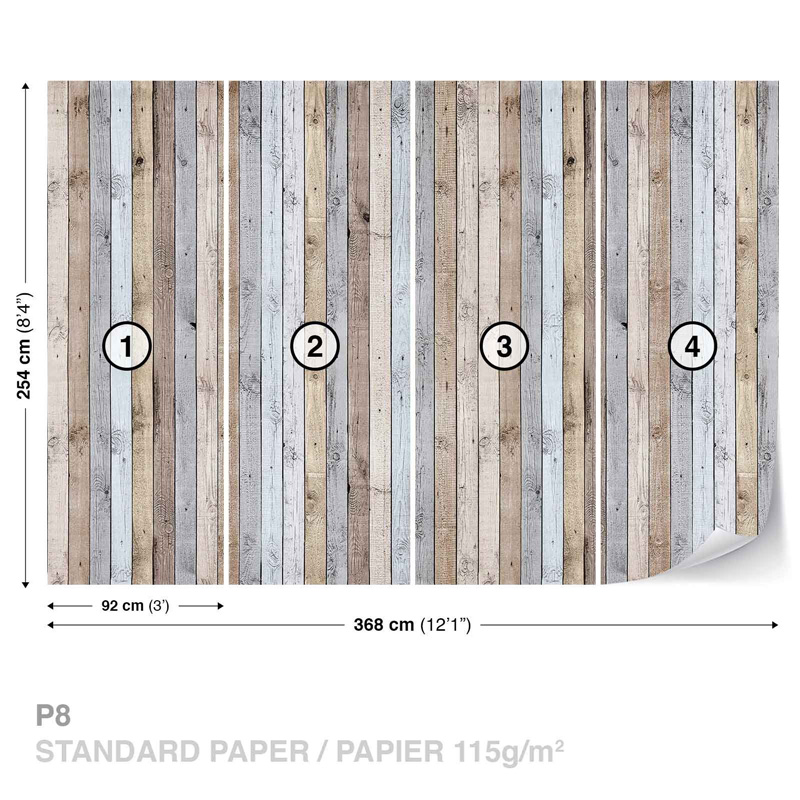 The photo wallpaper with wood texture measures 368 x 254 cm and is divided into 4 rolls, each measuring 92 x 254 cm. It is desirable to apply the wallpaper by a specialist at room temperature.