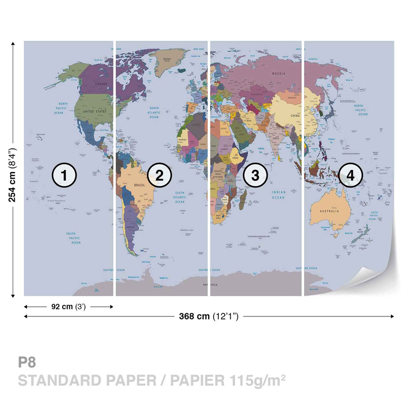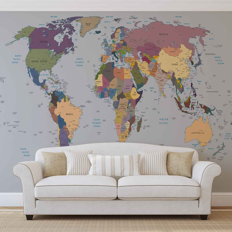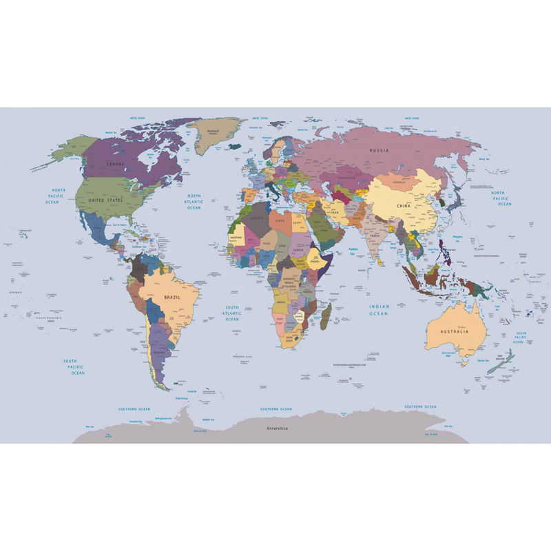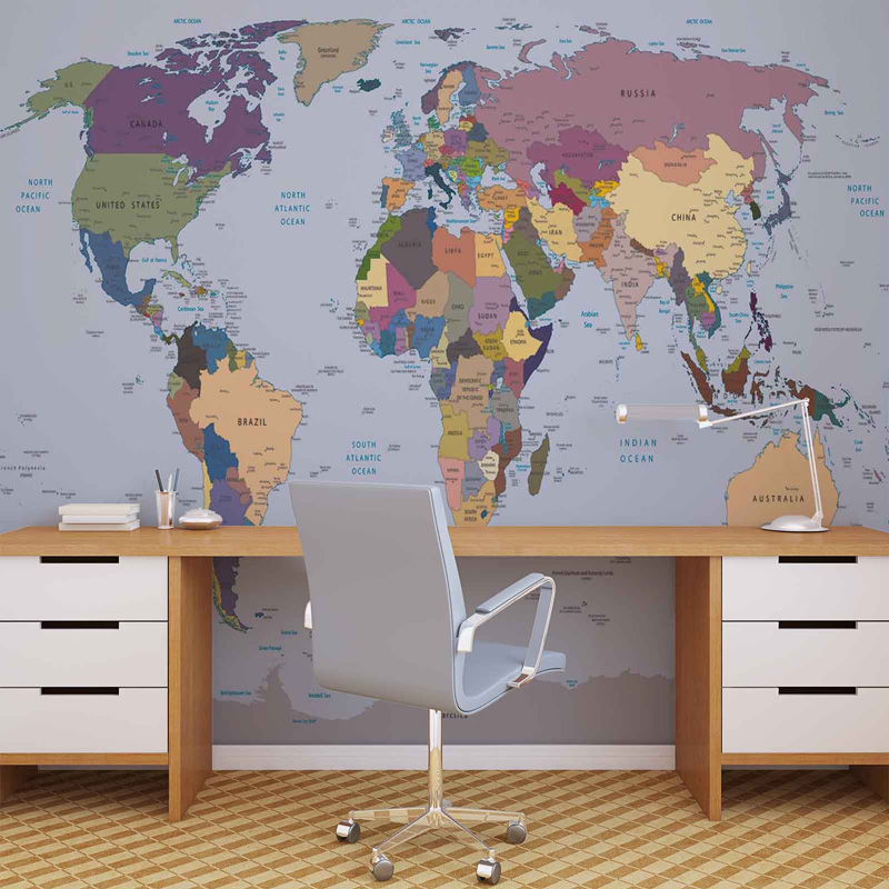 High-quality, wide-format photo wallpaper for a wall with a map of the world, on which the names of the countries and their capitals are written. Photo wallpaper is suitable for placing the wall in any room that is not exposed to high levels of humidity.