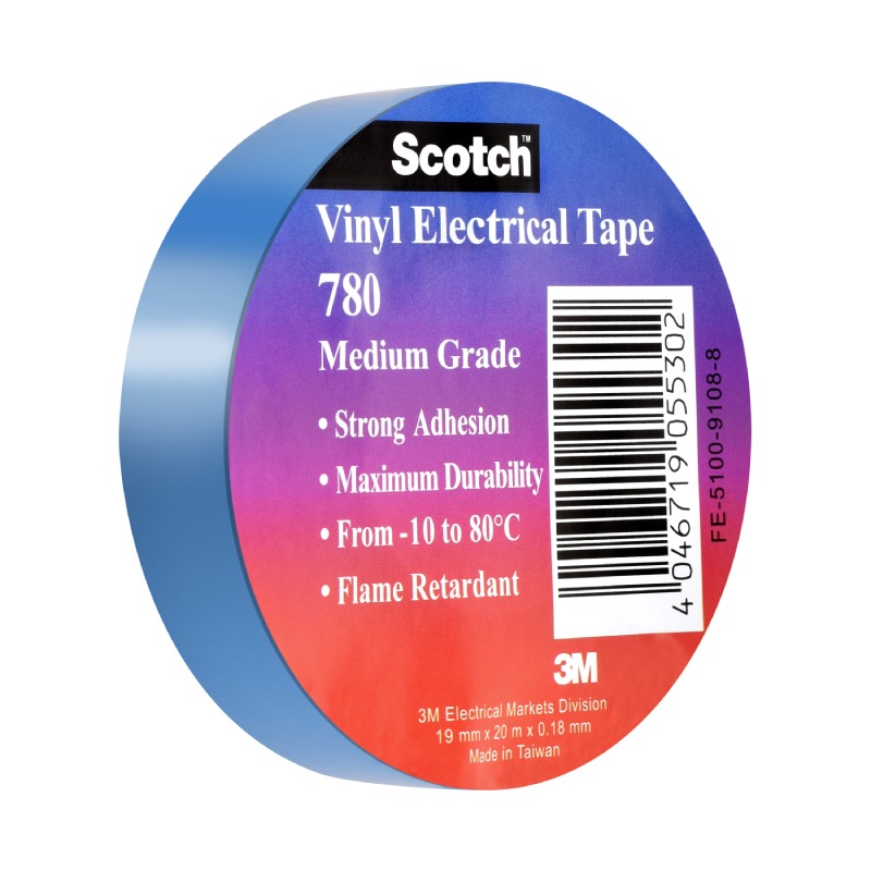 Blue insulating tape 3M Scotch 780, designed for insulation during electrical work. The tape is 0.178 mm thick. It is polyvinyl chloride (PVC), with high dielectric strength. It is characterized by convenience and ease of application. Provides good mechanical protection at minimum volume. The tape is of good quality, cold-resistant and withstands high voltages. The insulating tape is intended for general use. The dimensions of the tape in the roll are 19mm x 20m x 0.18mm.