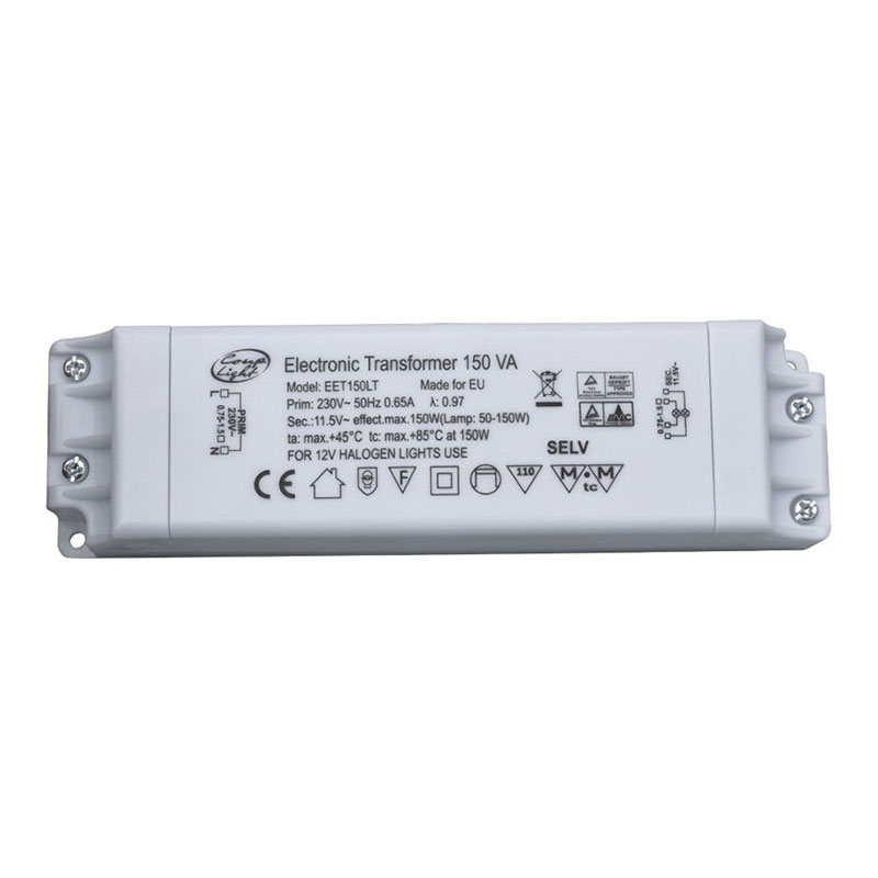 Electronic transformer 150W EET150LT for connecting halogen lamps. Designed to convert voltage from 220V to 12V. The electronic transformer is suitable for connecting freckles that require a voltage of 12V. It is suitable for rated loads from 35W to 105W. The operating temperature of the transformer is 45°C max and the maximum housing temperature reaches 80°C. The dimensions of the electronic transformer for halogen lamps are 151.5 x 41.5 x 30 mm. Allows installation in suspended ceilings and installation above furniture.
