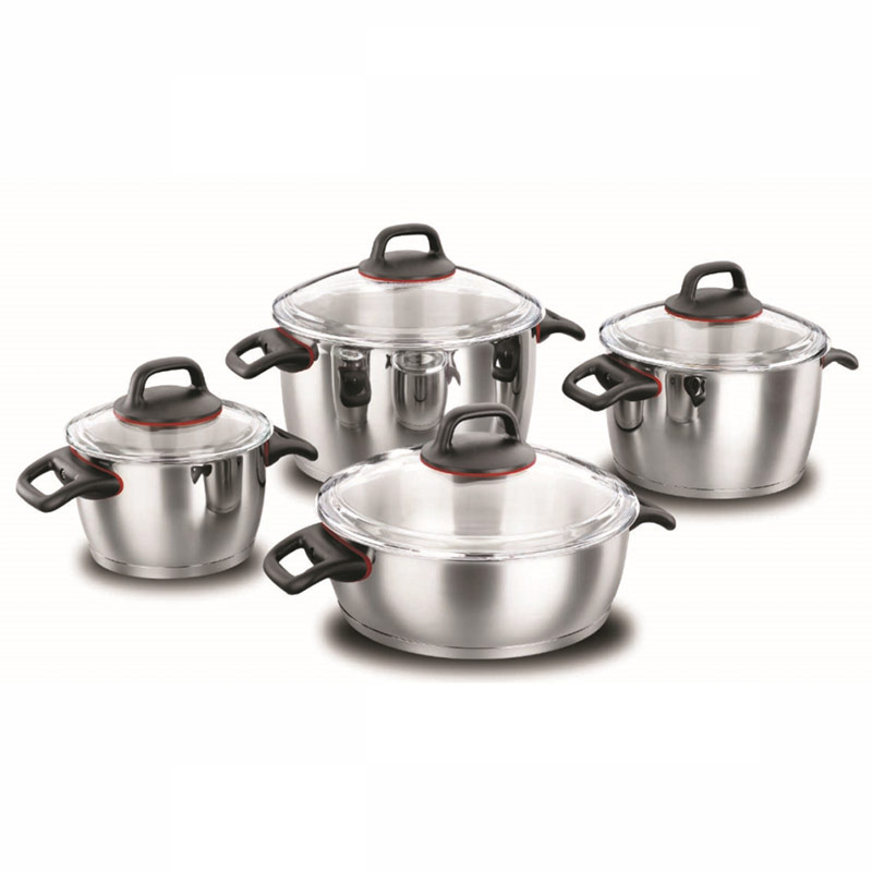 The set includes 4 cookware and 4 lids. The body of the pots is made of high quality chrome-nickel /Cr-Ni/ stainless steel 18/10. The lids are made of heat-resistant glass. The body has a finely polished surface that retains heat when cooking with the pot in the appliance itself. This saves energy and cooking resources. The handles are ergonomic and do not heat up. They are made of high quality bakelite, resistant to heat, moisture and wear. The base is encapsulated, providing homogeneous heat transfer. The inner and outer surfaces of the pots are durable, polished, with high quality coatings. This ensures exceptional dishwashing hygiene.