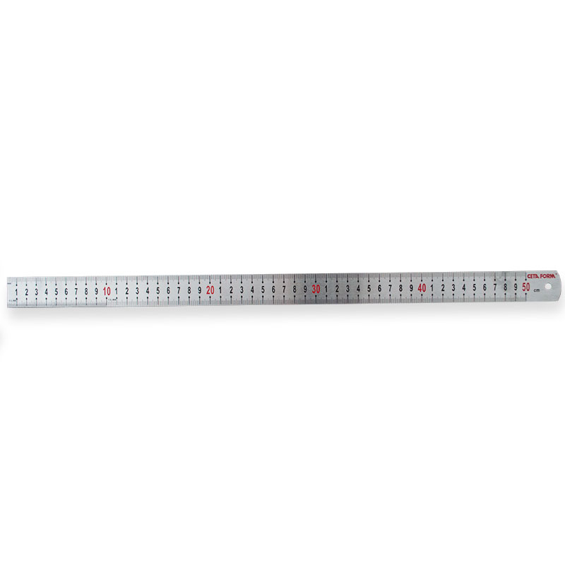 Metal line CETAFORM with a length of 500 mm. It is used for measuring materials, objects and elements used in carpentry and construction and repair activities. The metal line has a special UV coating, which guarantees higher efficiency and durability of the item. It is made of aluminum, which is resistant to wear, moisture, mechanical changes and more. The metal line is permanently engraved with dimensions in both inches and centimeters. Available in gray and 30 mm wide.