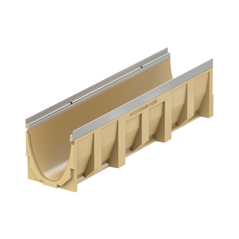 Drainage gutter with V-section made of polymer concrete and protective edge made of stainless steel.