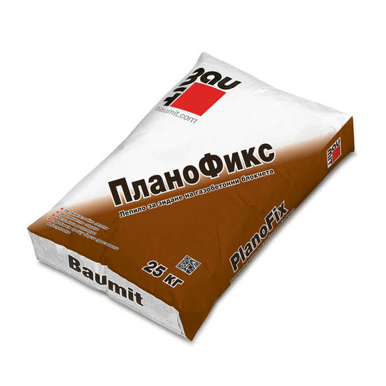 PlanoFix by BAUMIT is a dry mortar for gluing and masonry of aerated concrete blocks of group M 5 T, and ceramic bricks with flat adhesive surfaces. Available in a 25 kg bag.