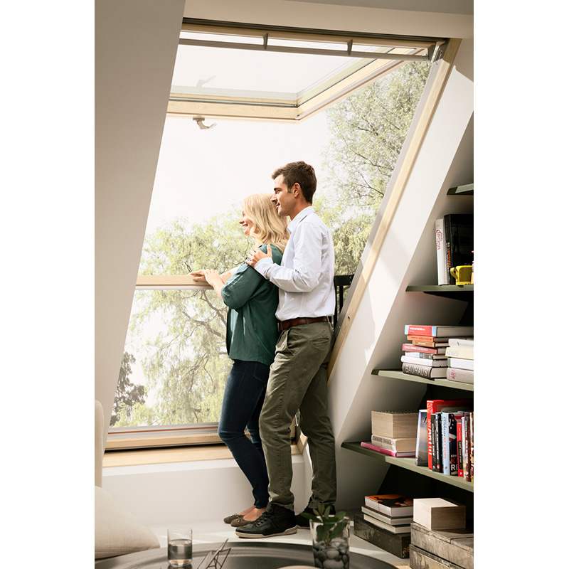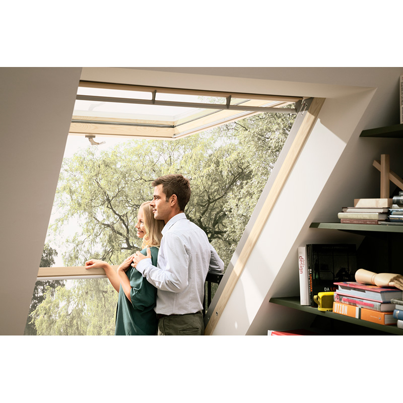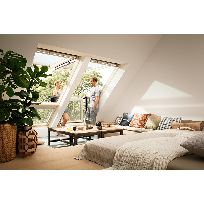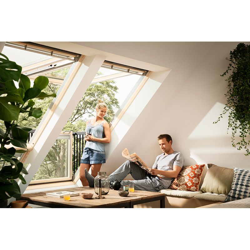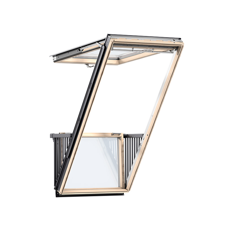GDL 3066 Cabrio GP2 PK19 roof window - lower part of the VELUX Premium series. Made of aluminum. It is installed on the slope of the roof like any other roof window. When opened, it turns into a balcony.