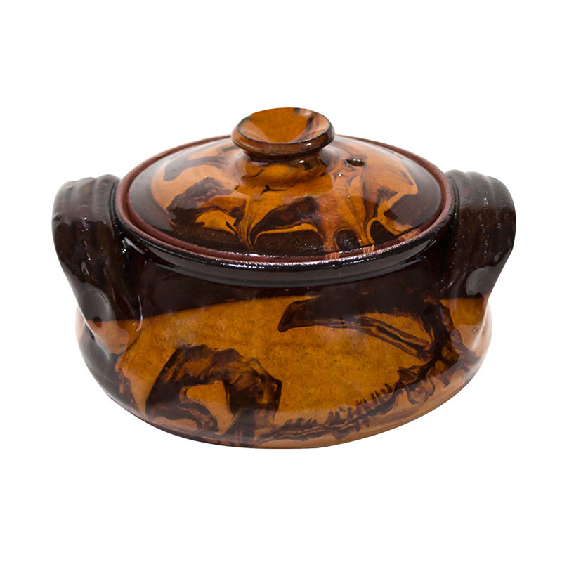 Ceramic dish with handles for making casserole. The casserole is glossy and brown. The capacity of the casserole is 600 ml.