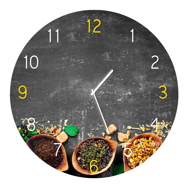 Beautiful wall clock GLASSCLOCK GC029 TEA brand STYLER. The wall clock is made using a special technology for printing on glass. Glass print printing guarantees a good aesthetic appearance, realistic colors with high photographic quality and resistance to weathering. The glass is impact resistant, not affected by temperature changes, as well as UV rays.